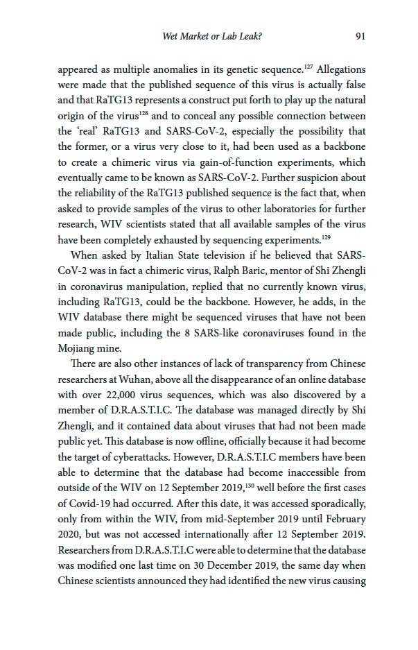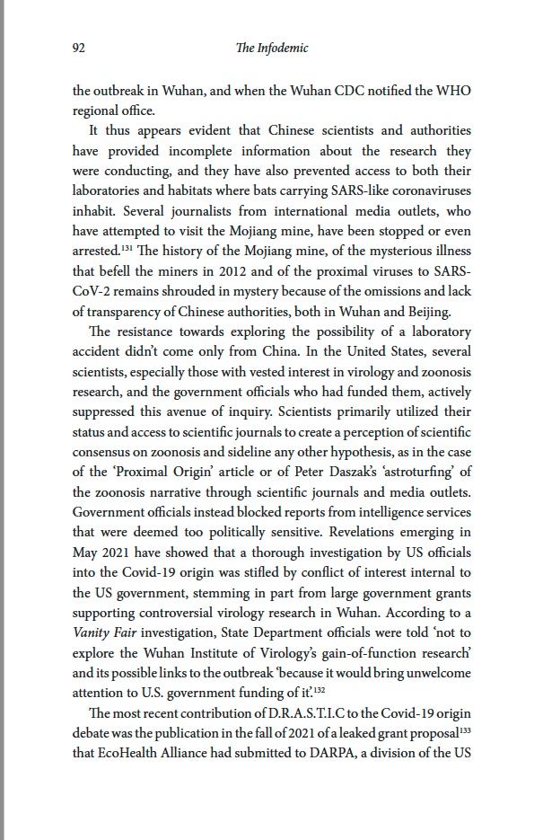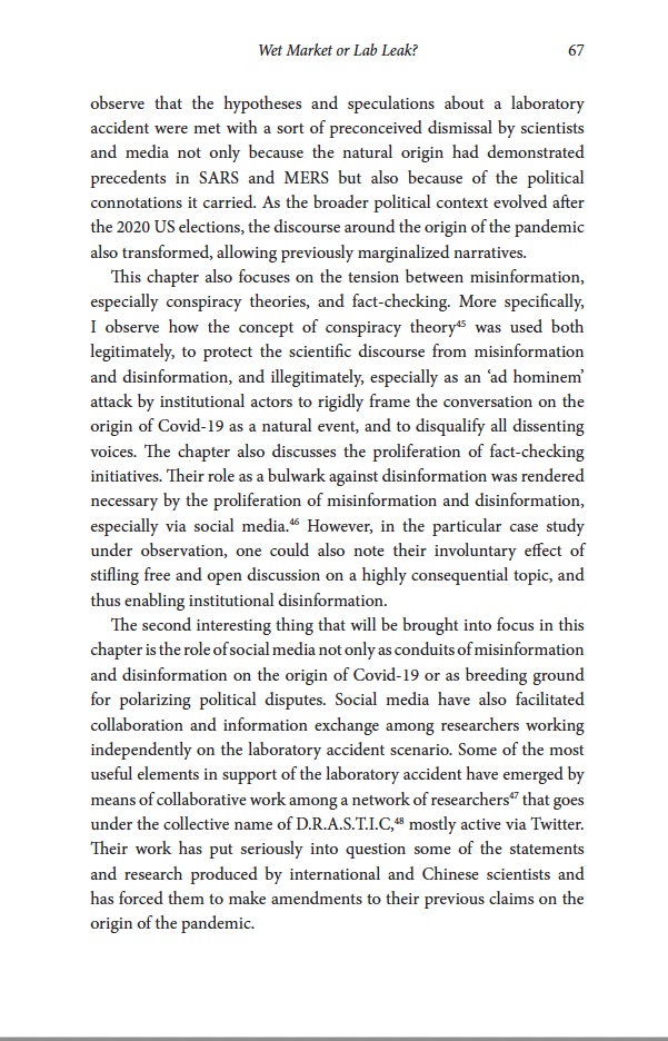 You can read the whole chapter “Wet Market or Lab Leak? Controversies on the Origin of Covid-19” in the recently published book: “The Infodemic. Disinformation, Geopolitics and the Covid-19 Pandemic” by Gabriele Cosentino