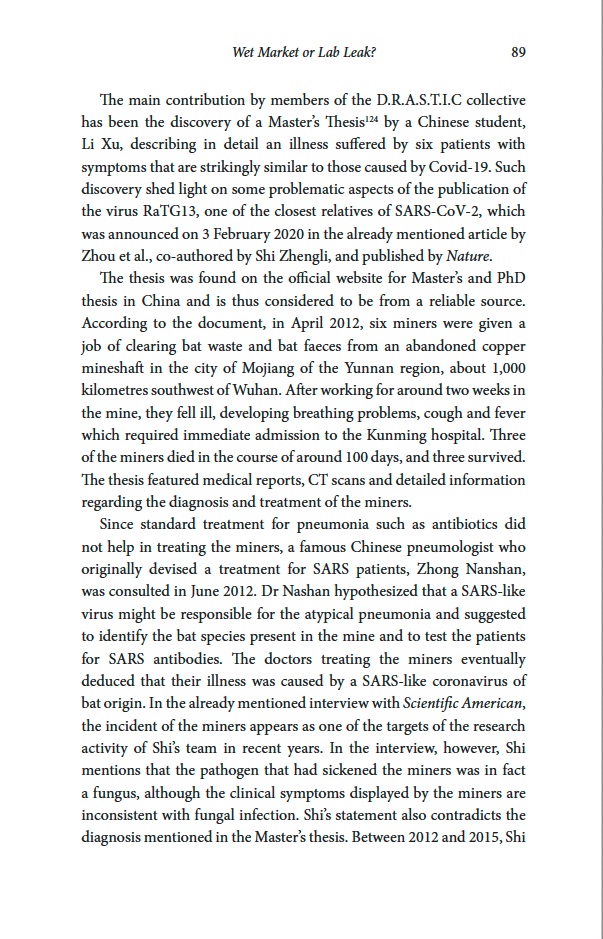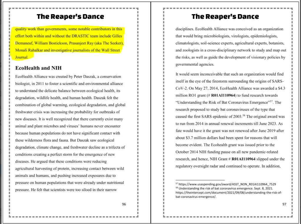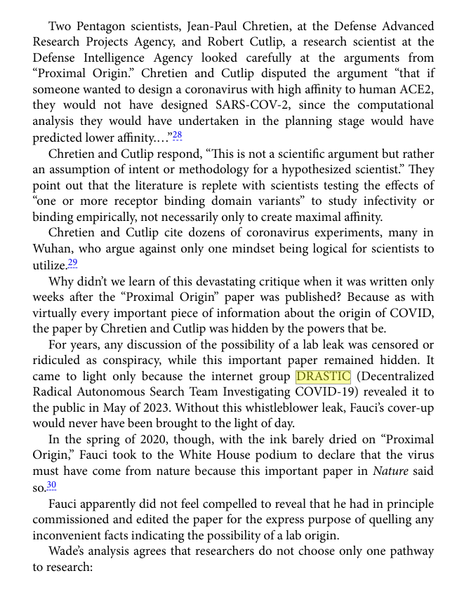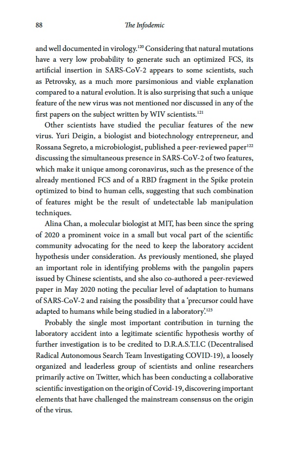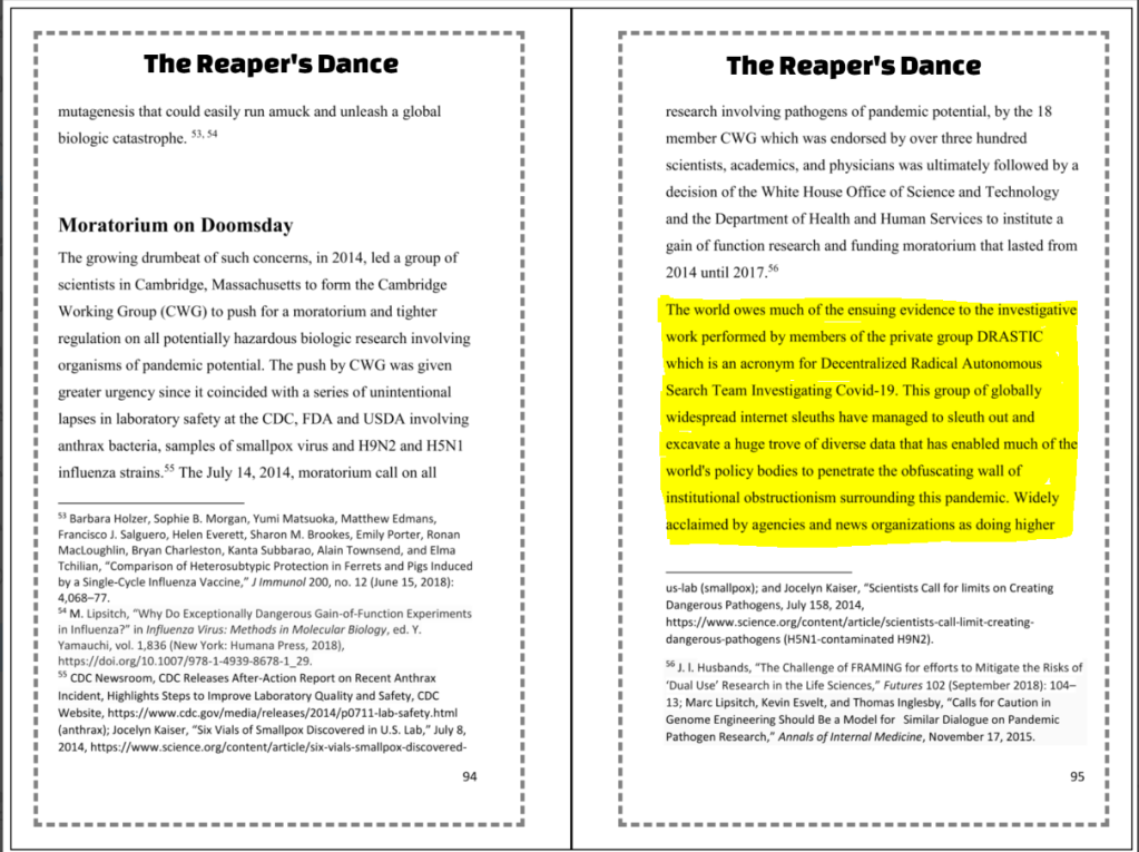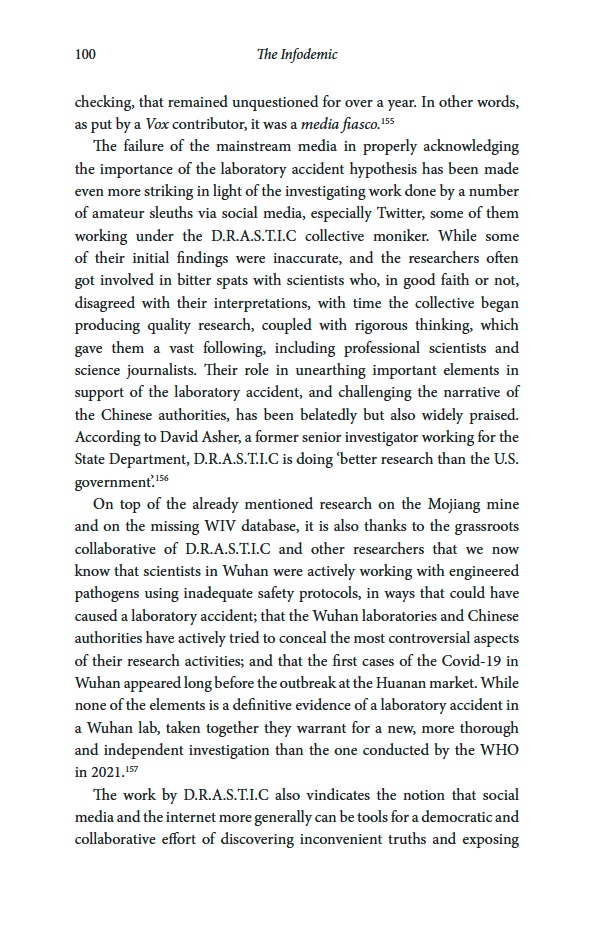 “Probably the single most important contribution in turning the laboratory accident into a legitimate scientific hypothesis worthy of further investigation is to be credited to D.R.A.S.T.I.C (Decentralized Radical Autonomous Search Team Investigating COVID-19), a loosely organized and leaderless group of scientists and online researchers primarily active on Twitter, which has been conducting a collaborative scientific investigation on the origin of Covid-19, discovering important elements that have challenged the mainstream consensus on the origin of the virus”